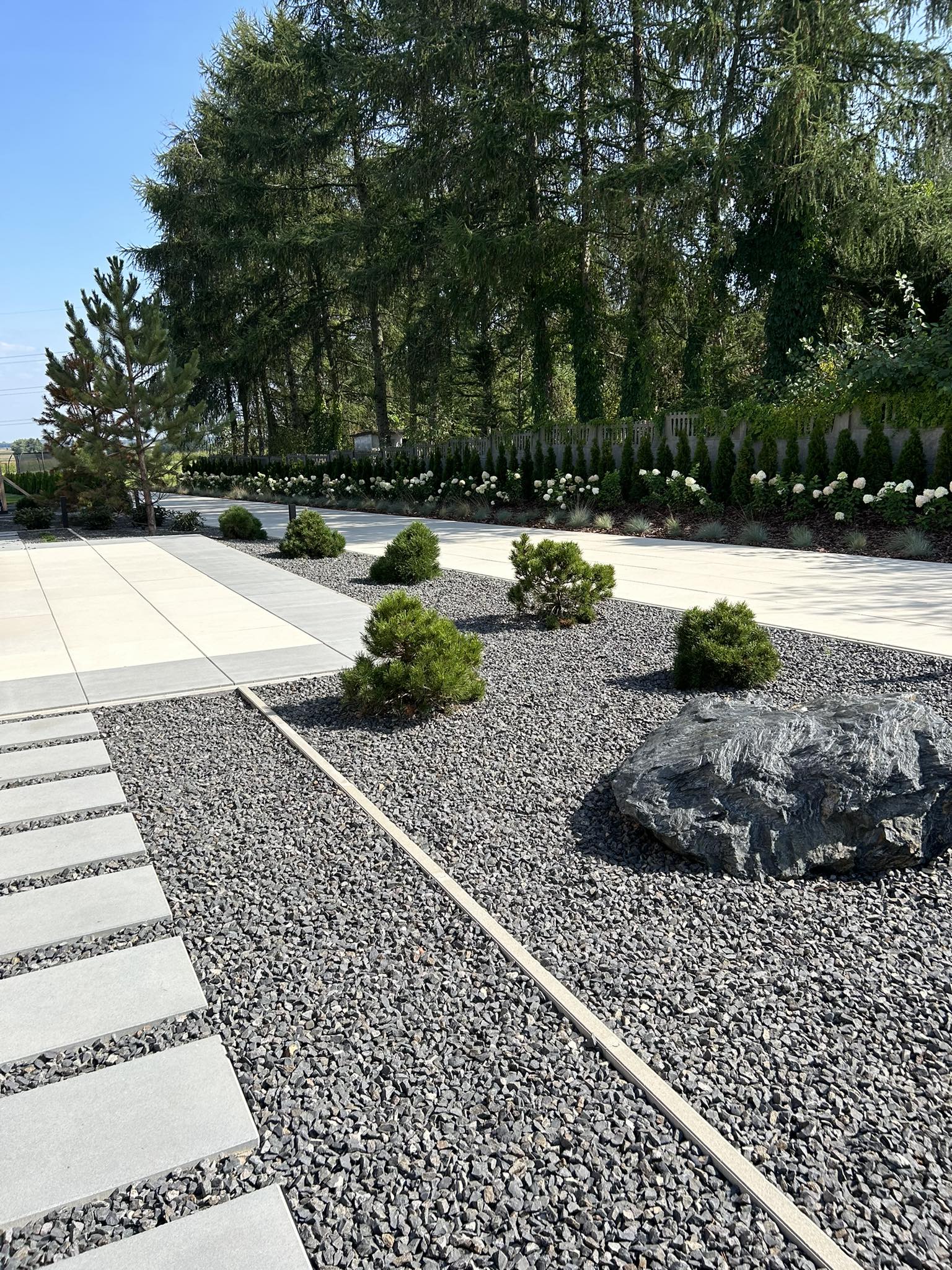 Nasza praca nie skończyła się na tym. Nasadziliśmy również rośliny w rabatach, aby stworzyć piękne kompozycje kolorystyczne i zdobić przestrzeń oraz posadziliśmy duże drzewa w trawniku.