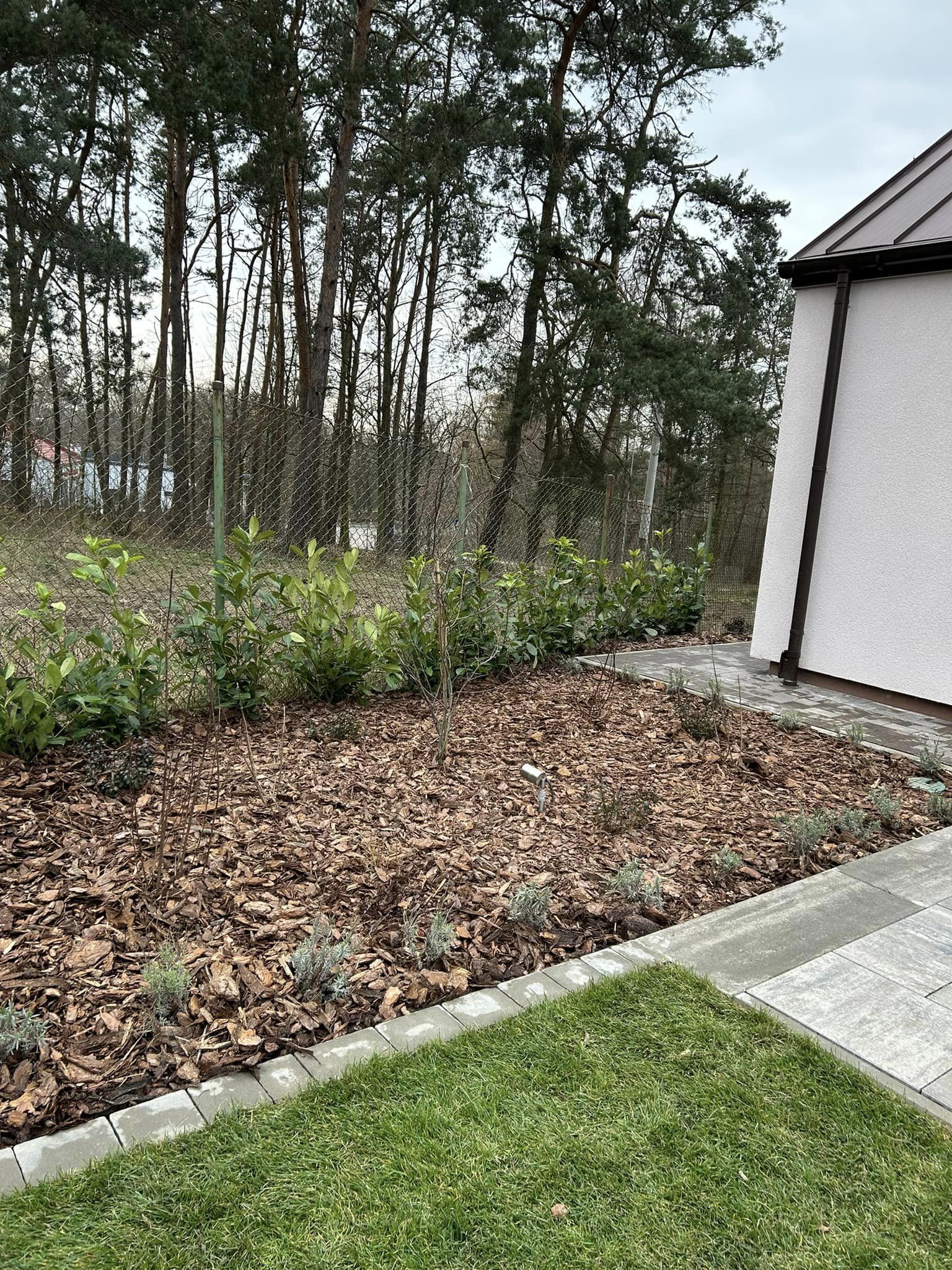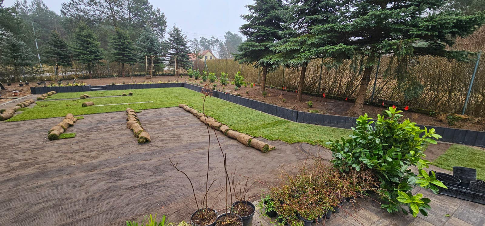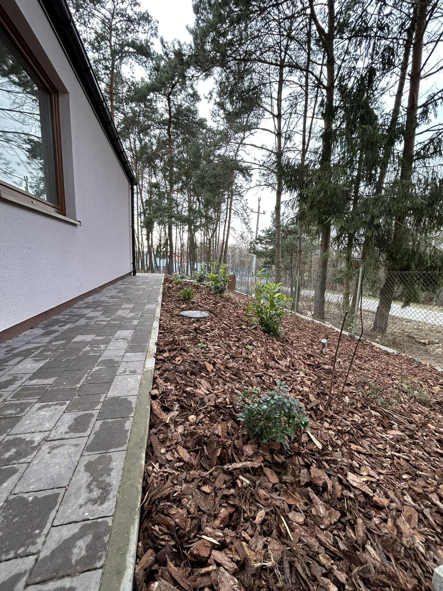 Wykonaliśmy prace brukarskie, urządziliśmy rabaty, posadziliśmy rośliny ozdobne i owocowe, oraz zainstalowaliśmy w pełni automatyczne oświetlenie w rabatach. Ułożyliśmy również trawnik z rolki z siatka na kreta.