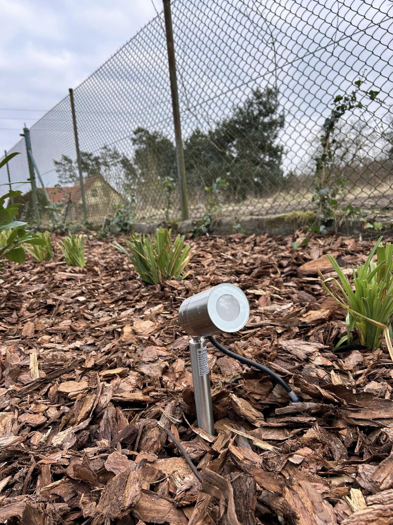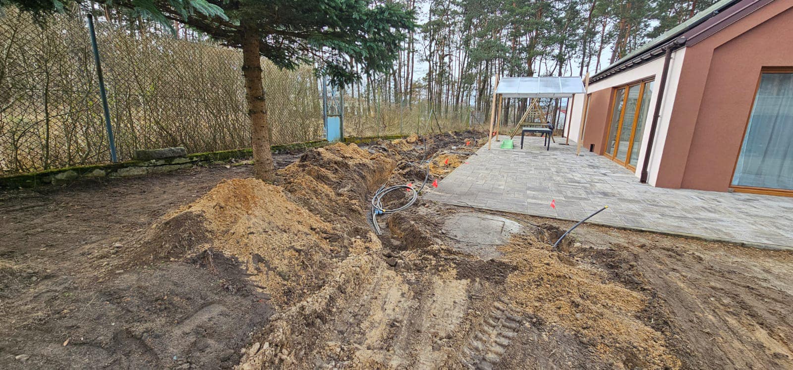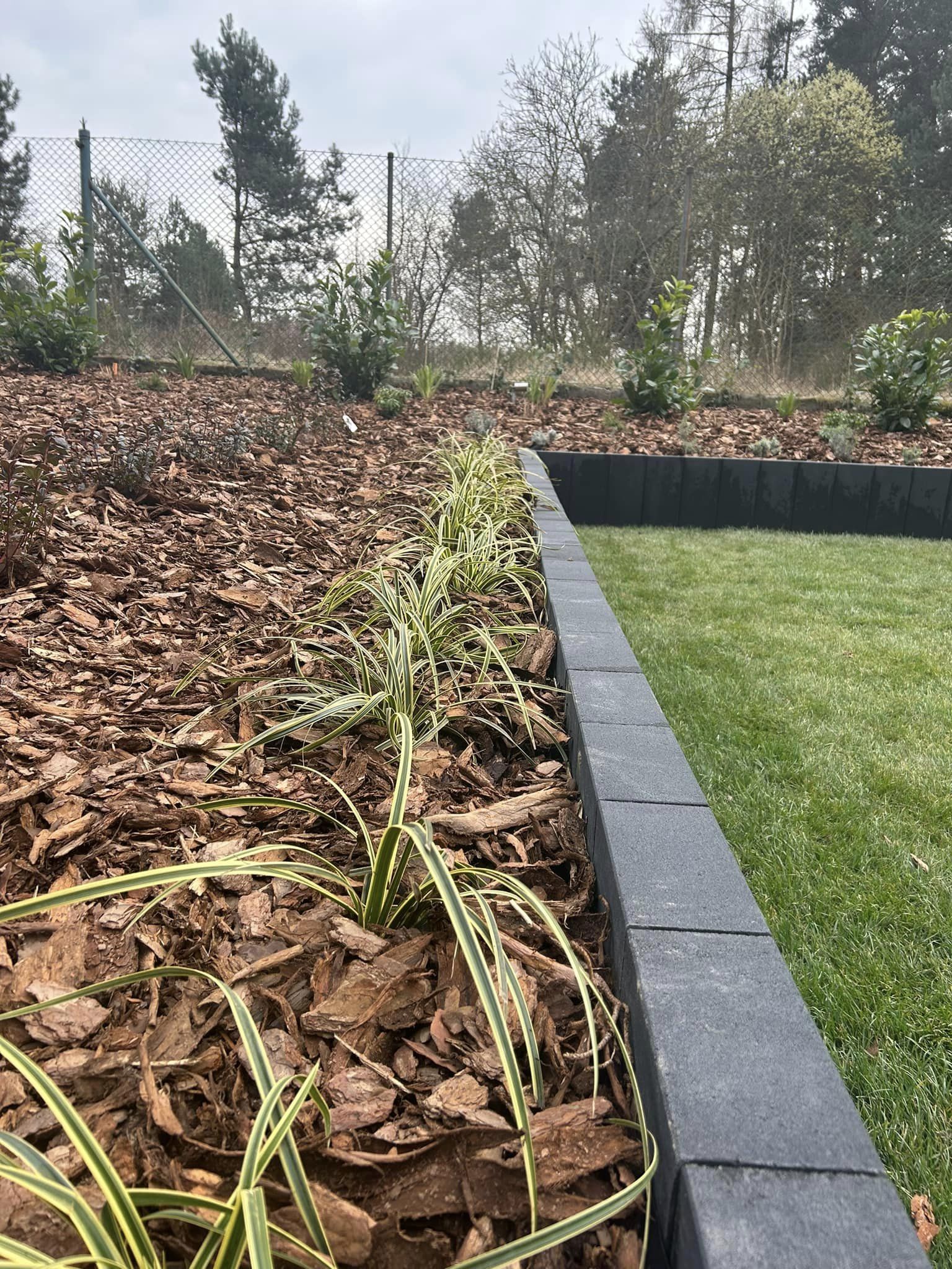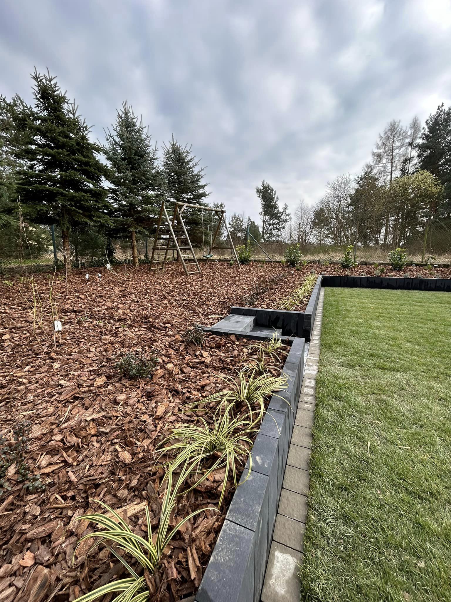 Wykonaliśmy prace brukarskie, urządziliśmy rabaty, posadziliśmy rośliny ozdobne i owocowe, oraz zainstalowaliśmy w pełni automatyczne oświetlenie w rabatach. Ułożyliśmy również trawnik z rolki z siatka na kreta.